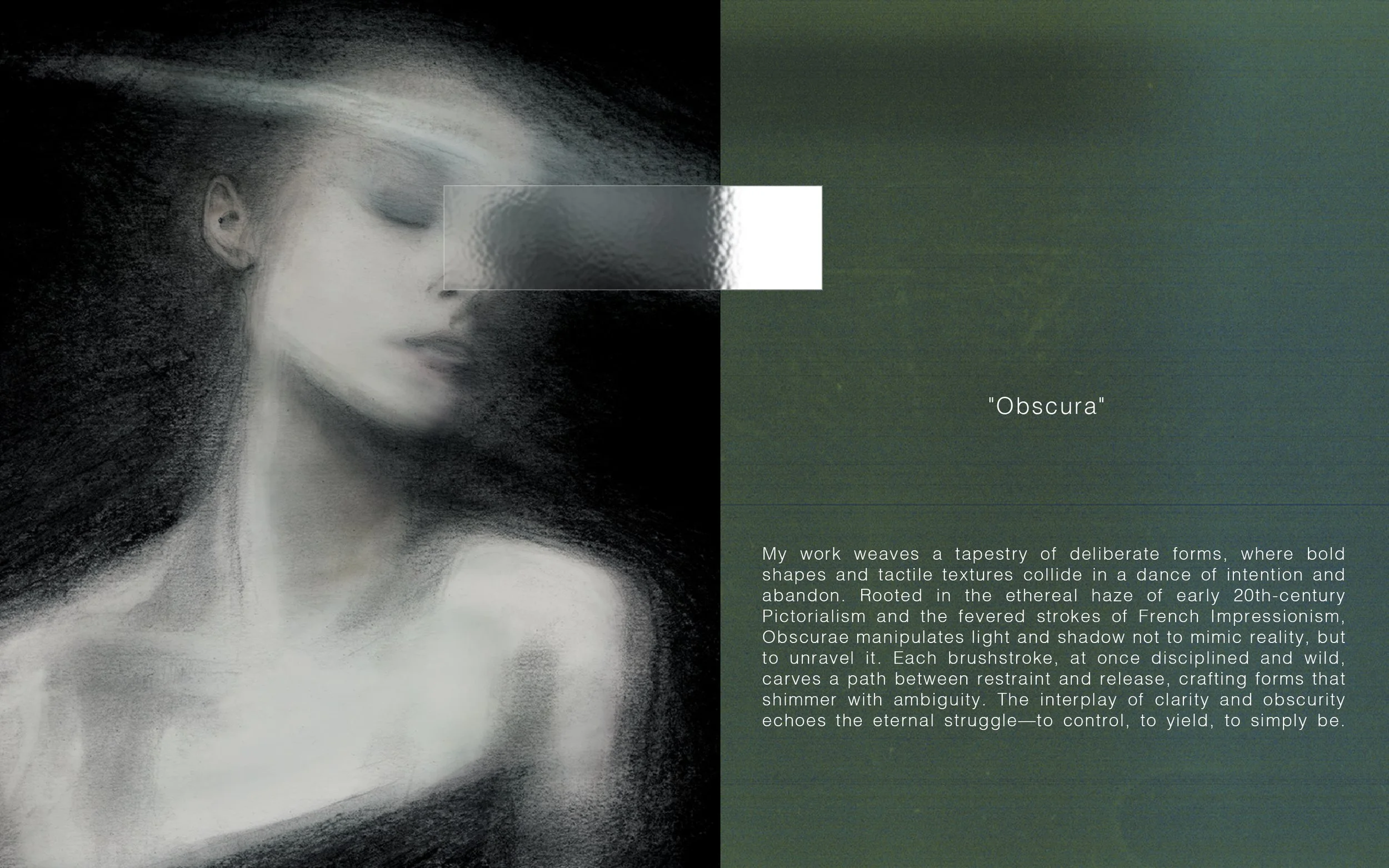 "Through various painting techniques, I found that creating a perfectly detailed piece made it difficult to fully express the restlessness, struggle, and emotions buried within me. Sometimes, the image on paper diverges from the vision in my heart. Rather than chasing perfection, I learned to let go—releasing all attachment to technique and allowing the raw essence of my inner world to emerge. That is how 'Obscurae' was born.